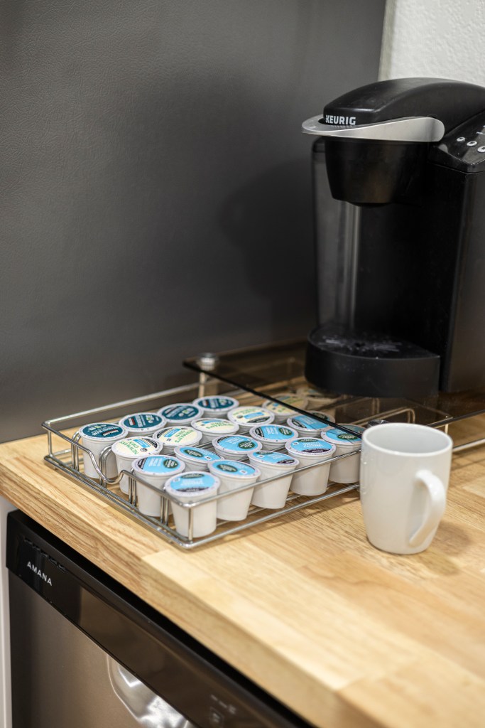 | Coffee Pot, Pods, Pod Holder | I’ll leave this one up to you! We haven’t had any issues with our Keurig. We do choose to run water through it and dry out the water compartment for cleaning. This is an added step that may be avoided with other coffee pots. We get our K-cups at Costco. |